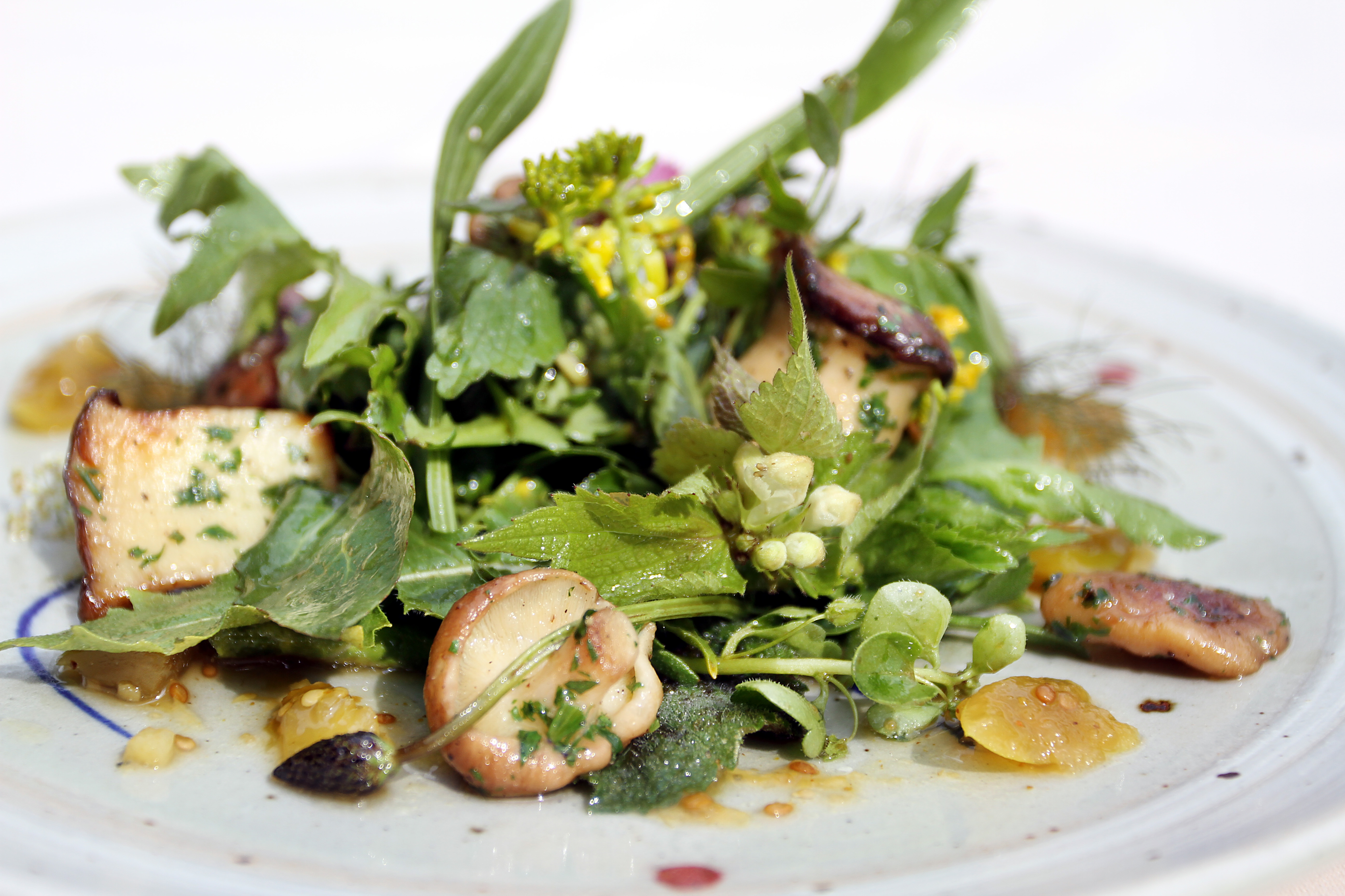 Ich kenne die Welt nicht ohne die Keramik aus der Töpferei Heckmann: Bereits meine Eltern kauften bei Michael Heckmanns Eltern für ihren privaten Bedarf. Michael und ich sind in etwa gleich alt. Als ich mich 2007 mit dem Hofgut selbständig machte, hatte er kürzlich den Betrieb seiner Eltern übernommen. Von Anfang an sollte mein Restaurant mit dieser sorgsam und liebevoll gefertigten Gebrauchskeramik bestückt sein. Für die erste große Bestellung fertigte Michael Heckmann mir eigens seine grau-bunte Linie an. Hier mit dem legendären Wildkräutersalat von Ivonne Ullrich.