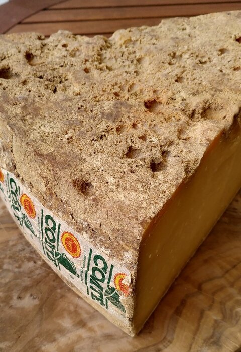 Der Comté de Garde Exception ist ein seltenes, wertvolles Produkt mit einer dichten, brüchigen Krume, die von den Kristallen der Proteolyse durchsetzt ist. Optisch ist er gelblich mit einer durchsetzten, porösen Kruste, die die Handschrift ungefährlicher Milben trägt.