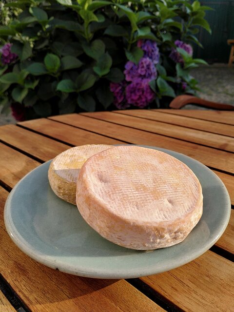 Beim Endprodukt aus Ziegenmilch brach er mit den Konventionen und entschied sich nicht in Konkurrenz mit anderen Ziegenhöfen zu treten. Es war naheliegend und trotzdem ein wenig „wild“, dass er die Erfahrung bei der Herstellung des Munster fermier nutzt und damit einen kleinen, feinen Ziegenkäse im Stile des Munster seiner Eltern herstellt. Das Produkt ist im wahrsten Sinne des Wortes einzigartig. Die Käschen wiegen ca. 150g.